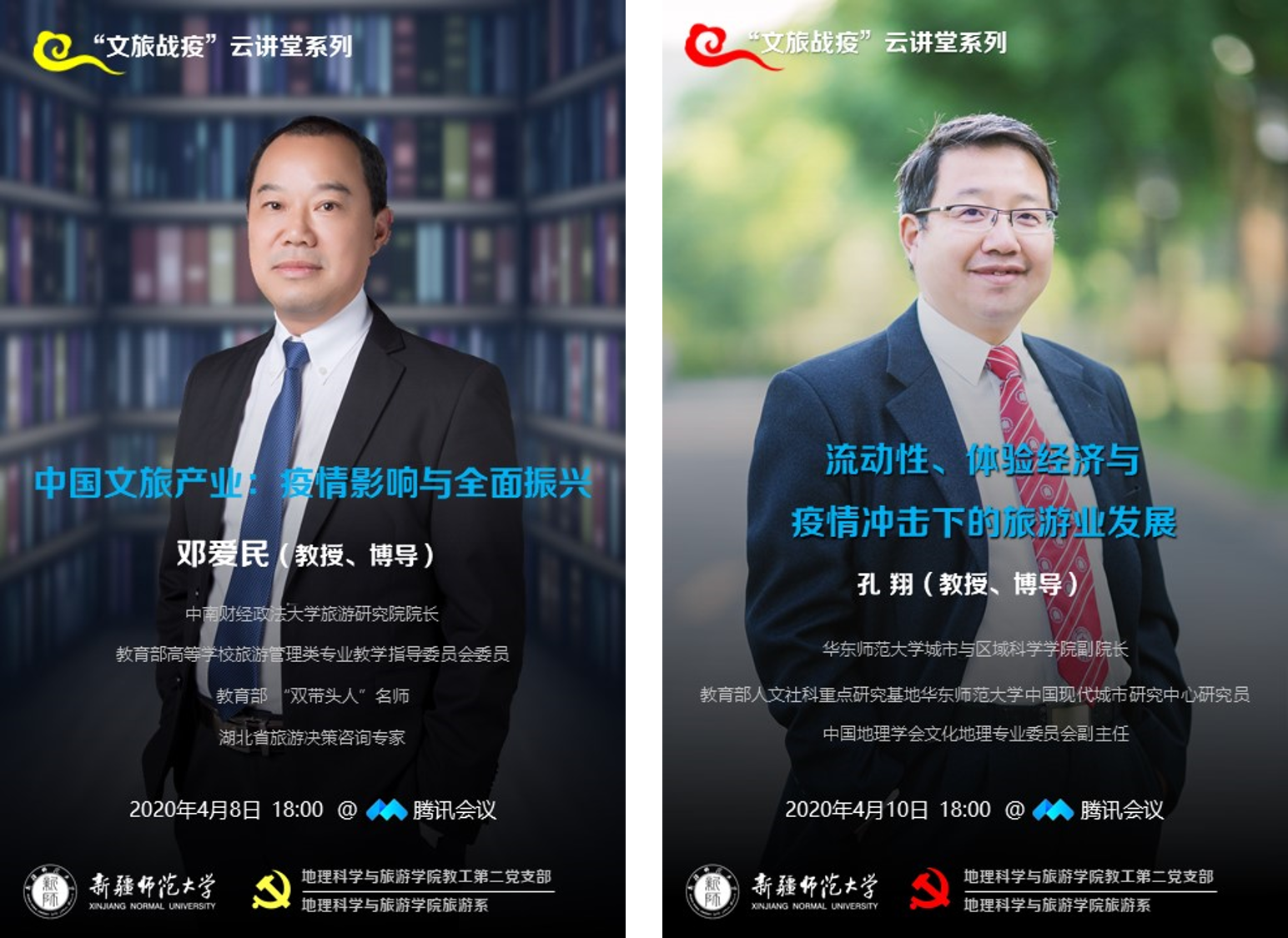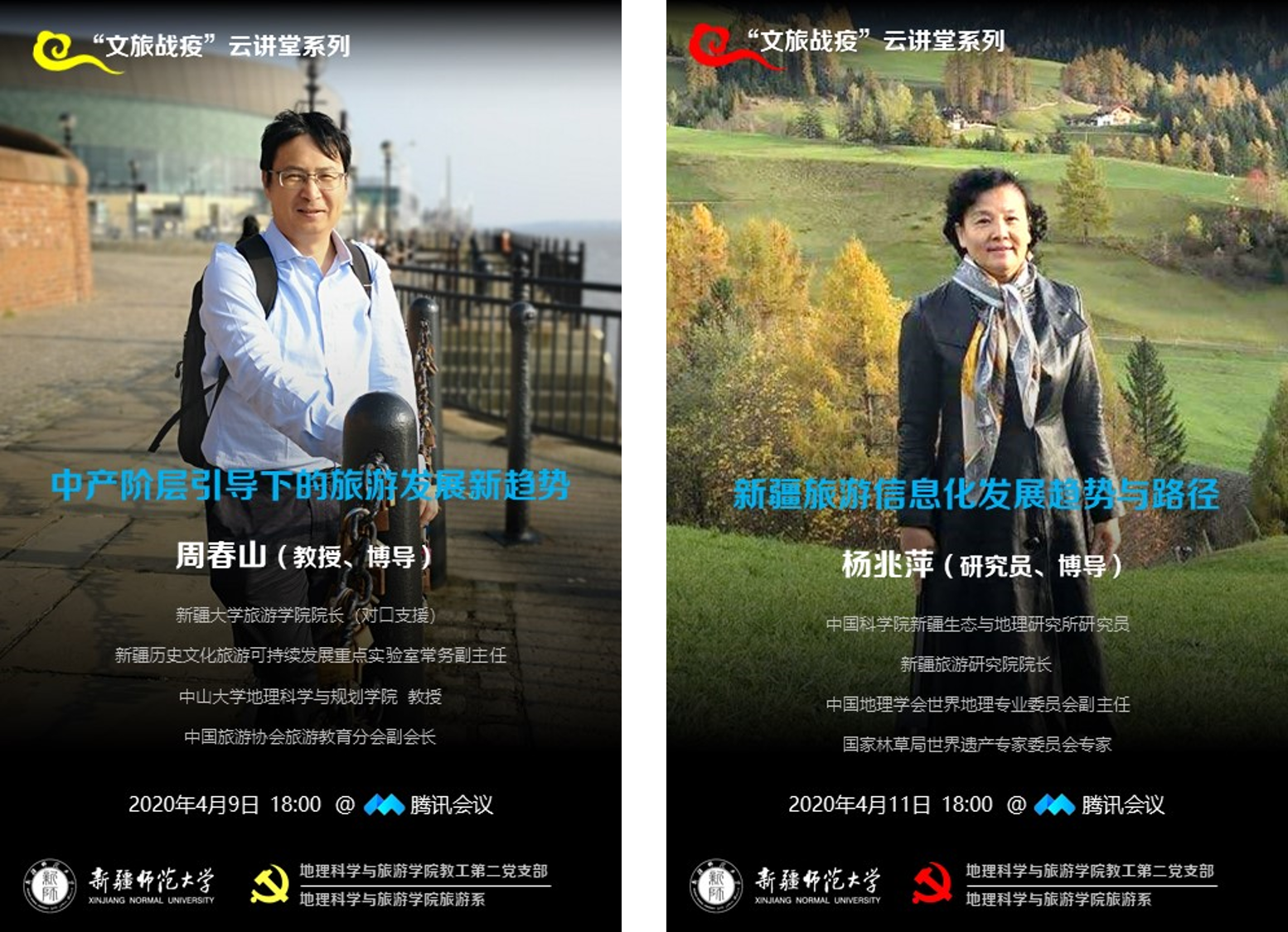 教工第二党支部和旅游系结合专业特色发起了“文旅战疫”云讲堂活动,邀请文旅大咖从不同的视角为旅游管理专业师生解读“战疫”之后文旅产业的应变之道。应邀参加此次活动的专家有中南财经政法大学旅游研究院院长、教育部“双带头人”、教育部高等学校旅游管理专业教学指导委员会委员邓爱民教授;新疆大学旅游学院院长、新疆历史文化旅游可持续发展重点实验室常务副主任、中国旅游协会旅游教育分会副会长周春山教授;华东师范大学城市与区域科学学院副院长、教育部人文社科重点研究基地研究员、中国地理学会文化地理专业委员会副主任孔翔教授和新疆旅游研究院院长、国家林草局世界遗产专家委员会专家、中国科学院新疆