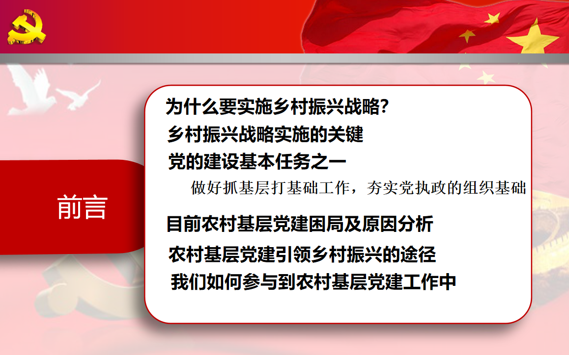 报告主要由六个部分组成,为什么要实施乡村振兴战略;乡村振兴战略实施的关键;党的建设基本任务之一;目前农村基层党建困局及原因分析;农村基层党建引领乡村振兴的途径;我们如何参与到农村基层党建工作中。
