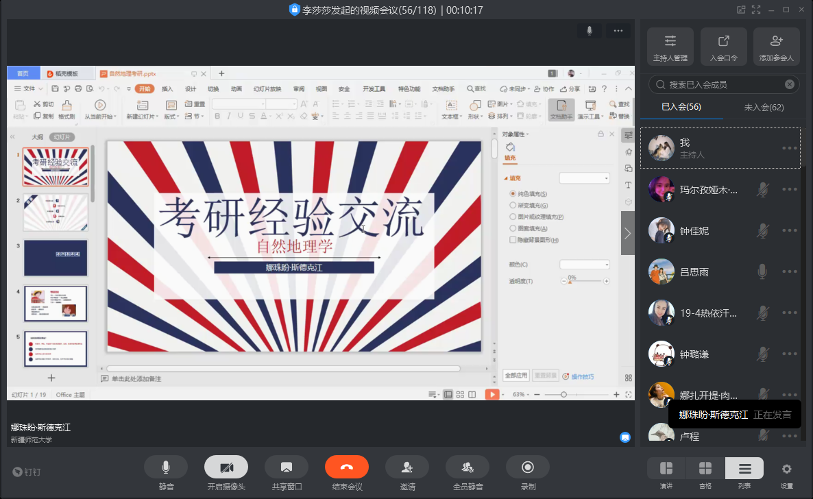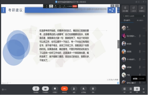 的考研群体在钉钉上开展了以“考研经验交流”为主题的活动。 参与这次交流会的有本科生一支部书记李锐老师、本科生一支部考取疆内外研究生代表4位同学以及学院有考研意愿的100余位同学。本次的会议由毕业生李莎莎同学主持。
