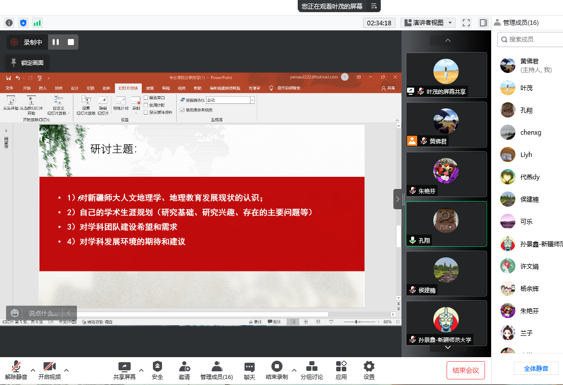 邀请华东师范大学城市与区域科学学院副院长、天池特聘教授孔翔老师于4月10日开展了线上“人文地理学暨边疆地理教育团队建设恳谈会”,本次会议由学院副院长叶茂、人文地理学系主任黄佛君共同主持,学院15位青年教师参加。