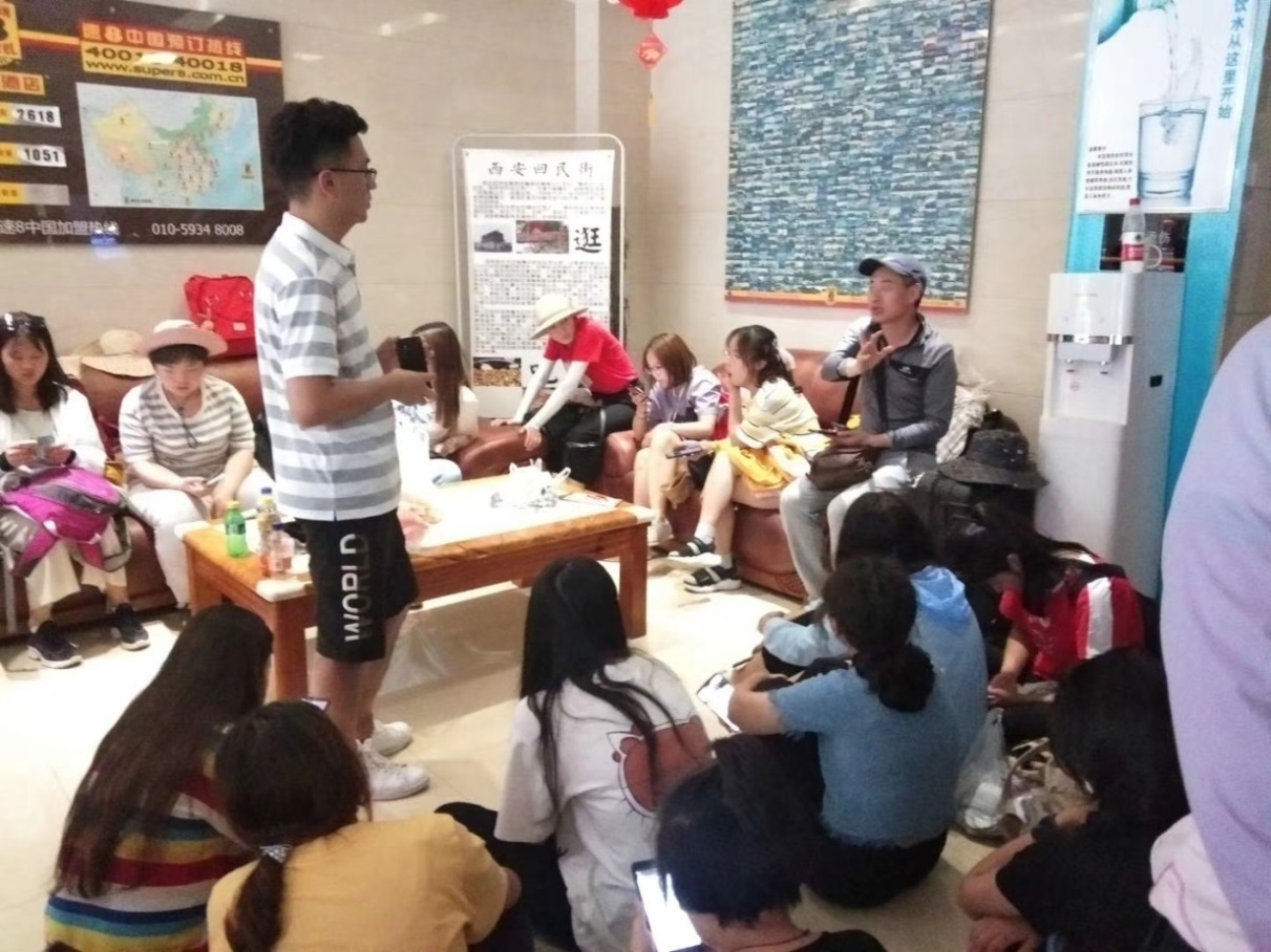 全体学生在宾馆大厅分组汇报西安实习的内容和心得体会
