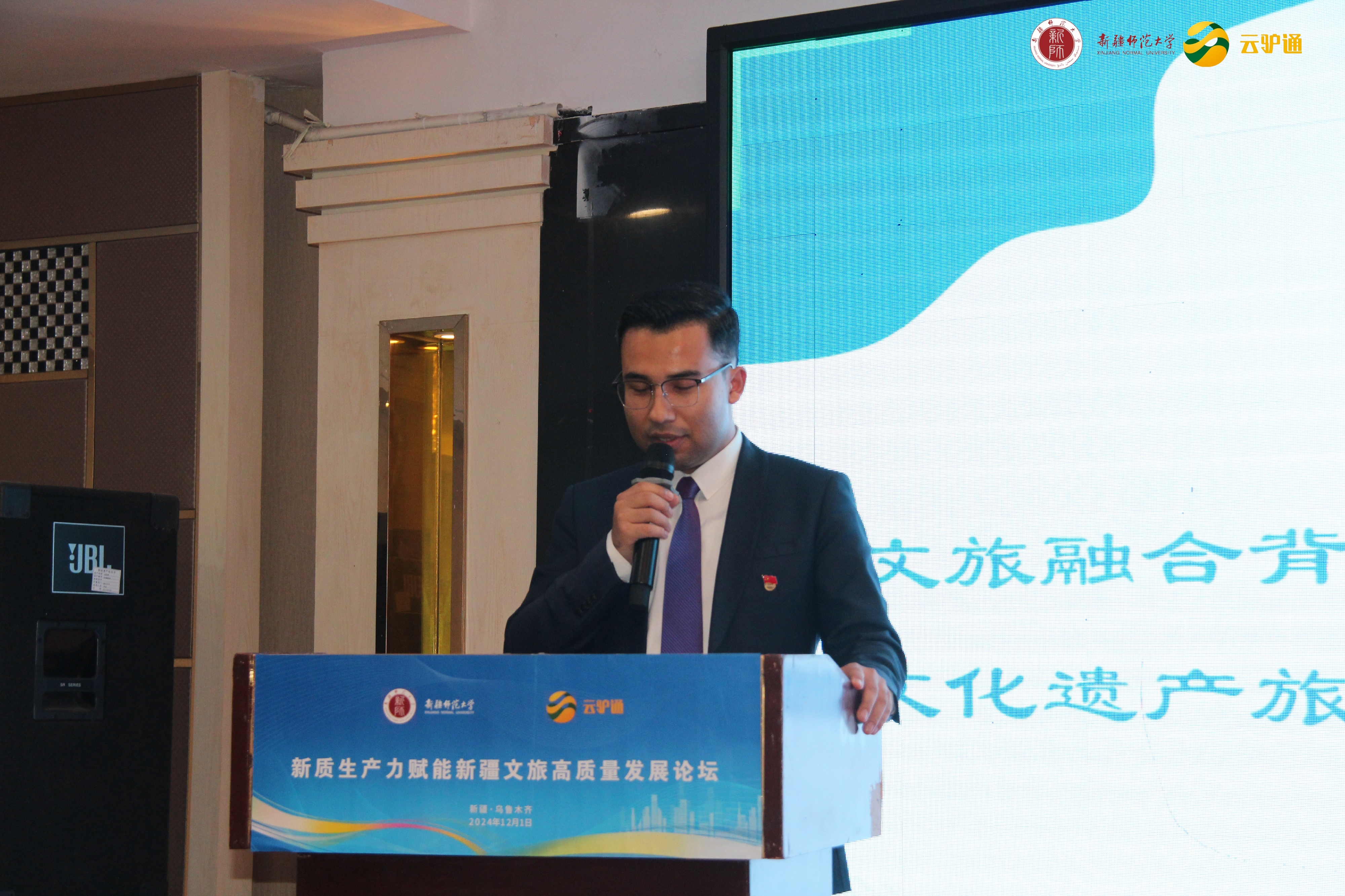 教师第二党支部书记伊尔凡江·艾合买提江博士主持。学院党委书记王勇辉教授在致辞中希望通过本次论坛,探讨新质生产力如何赋能新疆文旅产业,总结旅游发展新领域、新理论和新方法,推动新时代旅游学科高质量创新发展。