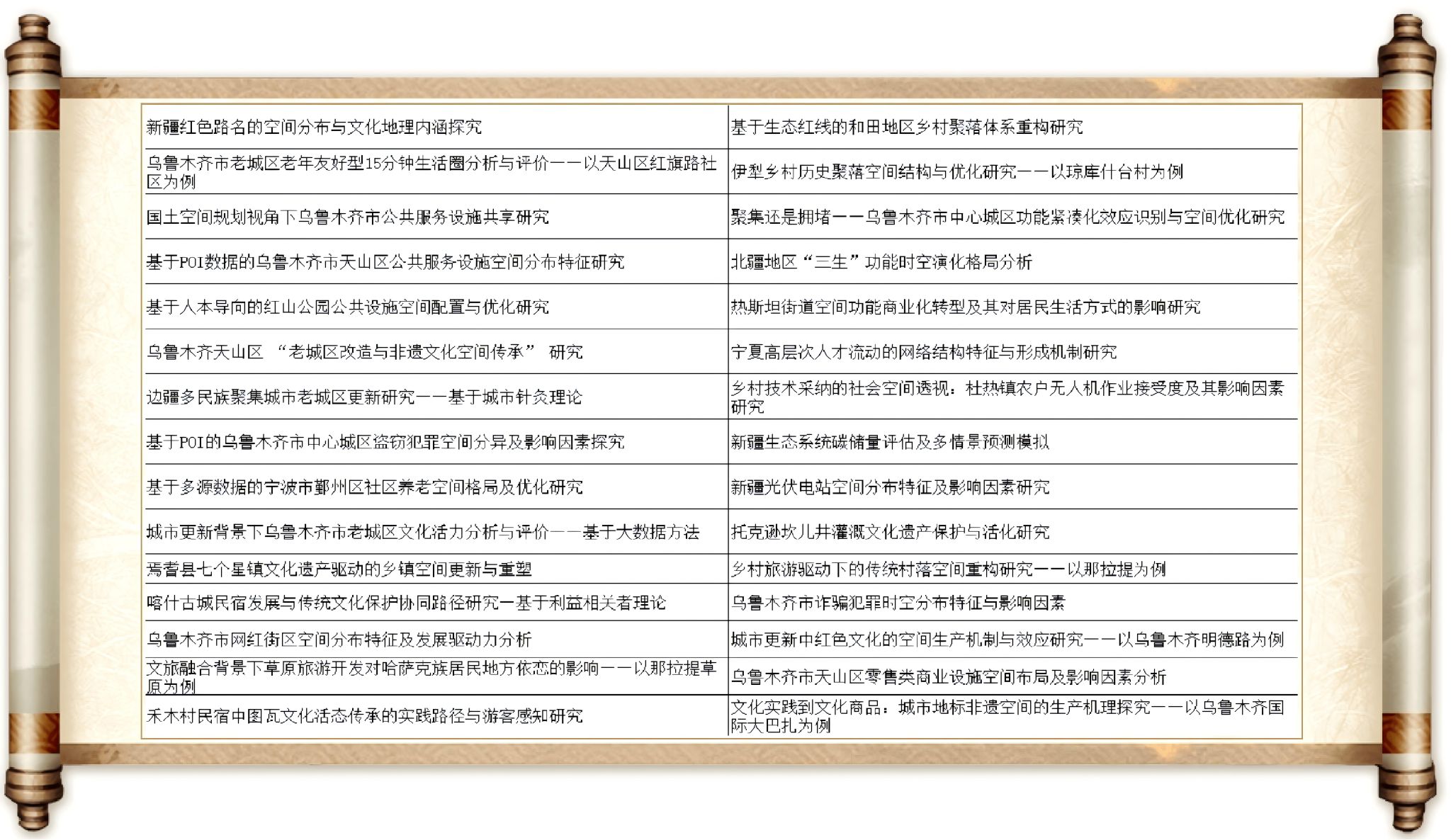 本届毕业论文选题亮点突出。一是聚焦国家发展战略与新疆发展实践需求,在以人为本的新型城镇化、国土空间规划背景下,选题紧密围绕乌鲁木齐这一特大城市的老城区、地方性中小城市的中心城区的城市更新,文旅融合发展与乡村产业振兴、技术振兴、文化振兴、生态振兴,国土空间规划与区域三生空间功能优化等主题,体现了专业发展紧密结合行业市场需求、人才培养服务于社会发展需求这一核心育人理念。二是研究区的选择多关注家乡建设和发展,聚焦家乡发展的新变化、出现的新问题,表现出大学生发挥专业优势、建设美丽家园的社会责任感和专业认同感。这一专业素养并非朝夕养成。近两年在院系教师指导下,我系本科生主动参与各类学科竞赛、创新创业大赛积极性逐渐提高,特别是在活动中获得省赛、校赛多项奖项,连年获批省级大学生创新创业项目等成果,不但激发了学生的获得感,而且提升了专业认同和职业价值感,这成为推动毕业论文选题质量提升的重要内驱动力。